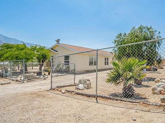 Perfect starter home with views of the beautiful mountains and stars at night! This property features big lot, 3 bedrooms, 2 full bathrooms with living room and family room. Kitchen has tile flooring, kitchen island and pantry for plenty of storage, it also has high vaulted ceiling and skylight. Kitchen has small tile backsplash and a lot of cabinet space. All kitchen appliances are included. Dining area features a chandelier. Family room has vaulted ceiling and big windows for plenty of natural lighting. The master bedroom has walk in closet and big master bathroom. Master bathroom features 2 sinks and bathtub and stand up shower. Bathrooms have tile flooring. A separate laundry room washer and dryer are included. This home has a big yard that is fenced for RV Parking, shop space and shed for plenty of storage. Located just a short drive from Palm Springs, Cabazon, and Morongo Casino, this property is ideal for those who want the peace and quiet of rural living with easy access to amenities.