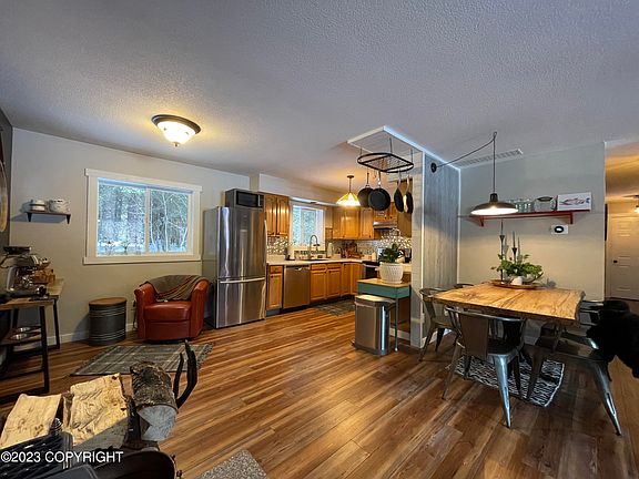 A three bedroom, two bathroom single story home in a quiet neighborhood outside of town. The home is on a large lot (1.24 acres) with tons of room in the back yard to add a guest cabin or just to enjoy the privacy. This home just had all new metal installed on the roof and new exterior paint and metal siding along with a whole new driveway installed making room for two car widths in 2022.Features to note are the eye catching blue wood stove with eye catching ceramic tile accent backing. Of course the full length front porch will be great for entertaining on those sunny summer evenings but you will also be able to watch the moose graze in your yard all winter long too.