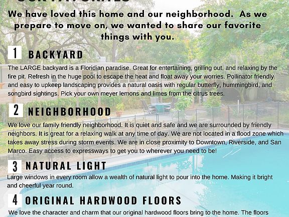 Lovely 3/2 POOL HOME New HVAC 2022, retiled & remarcited pool in 2020. New microwave, washing machine, & dishwasher. Fresh paint! Gorgeous original hardwood floors throughout. The home boasts an open & inviting living & dining room, spacious bedrooms, & a separate Florida room with views of the backyard. A wealth of natural light pours into each room making it bright & cheerful year round. Backyard paradise with sparkling pool, patios, fire pit area, & pollinator friendly landscaping. Desirable family friendly neighborhood great for walks admiring mature oak trees. Prime central location, close proximity to San Marco, Downtown & Riverside. Easy access to major interstates to get you where you need to be. Come see this gem today!