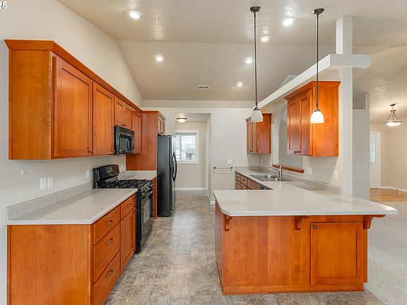 Welcome to this beautifully designed home featuring an open floor plan and stunning vaulted ceilings. The spacious kitchen is equipped with elegant black appliances, including a gas range, roomy refrigerator, built-in microwave and dishwasher, making it perfect for both everyday living and entertaining. Adjacent to the kitchen, a cozy dining area flows into the living room, which features a formal entry and impressive vaulted ceilings. The master suite is a true retreat, boasting vaulted ceilings, a large walk-in closet, and plenty of natural light. Bedrooms 2 and 3 include double closets, offering ample storage space. The laundry room is thoughtfully designed with numerous cabinets and comes complete with a washer and dryer for your convenience. Step outside to enjoy your private backyard oasis with a covered patio, perfect for relaxing or hosting gatherings plus an attached hobby room for your crafts. Additional features include apple trees, vehicle and RV parking, and a beautifully landscaped exterior. This home offers comfort, style, and functionality in one exceptional package. Schedule a tour today and see all that this property has to offer!