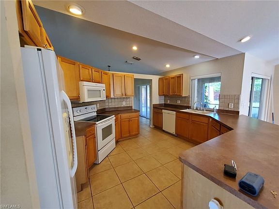 Great Location, near Del Prado Blvd and Veterans. This spacious 3 bedroom, 2 bath with a den offers over 2100 square feet of living space. Open floor plan from kitchen area to breakfast nook and family room. Kitchen has tile backsplash, wood cabinets and tray ceiling. Tile throughout except in bedrooms which have carpet. Large lanai perfect for enjoying this time of year. Fenced yard, large shed and barbecue pit. This yard has plenty of space for a pool should you want one.