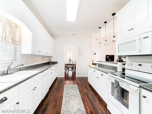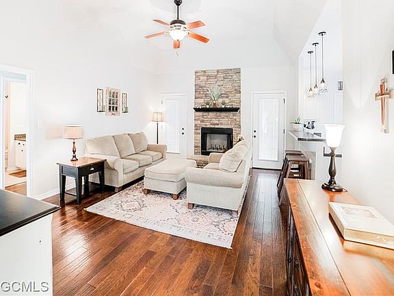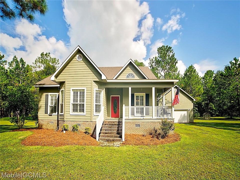 48 hour first right of refusal. Immaculate cottage on 10+/- acres in Grand Bay. Less than a mile from the interstate. Nestled along a gravel and dirt road, this secluded home features three bedrooms, two baths, hand scraped wood floors, wood burning fireplace, garden tub in master bath with separate shower, double walk-in closets in master bedroom, Hardy Board exterior, high ceilings throughout, fabulous back deck for entertaining and two car garage with covered walkway from garage to house. New indoor HVAC unit installed per seller in July 2020. Fenced and covered dog kennel on property. There is also 3 fenced acres in the back pasture perfect for horses and cows. The electric fence on the back 3 acres does not convey with property. All updates per the seller.