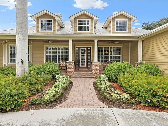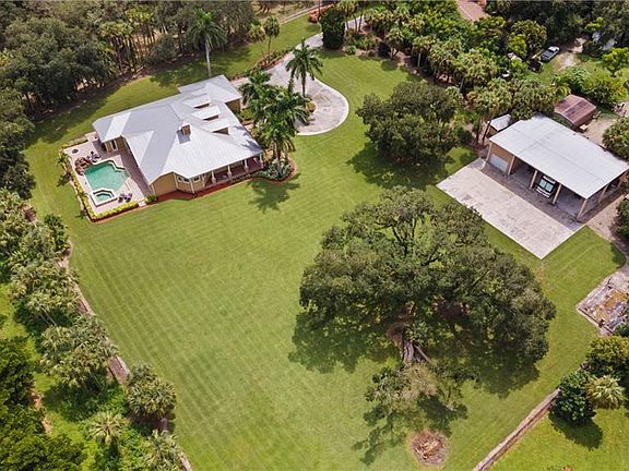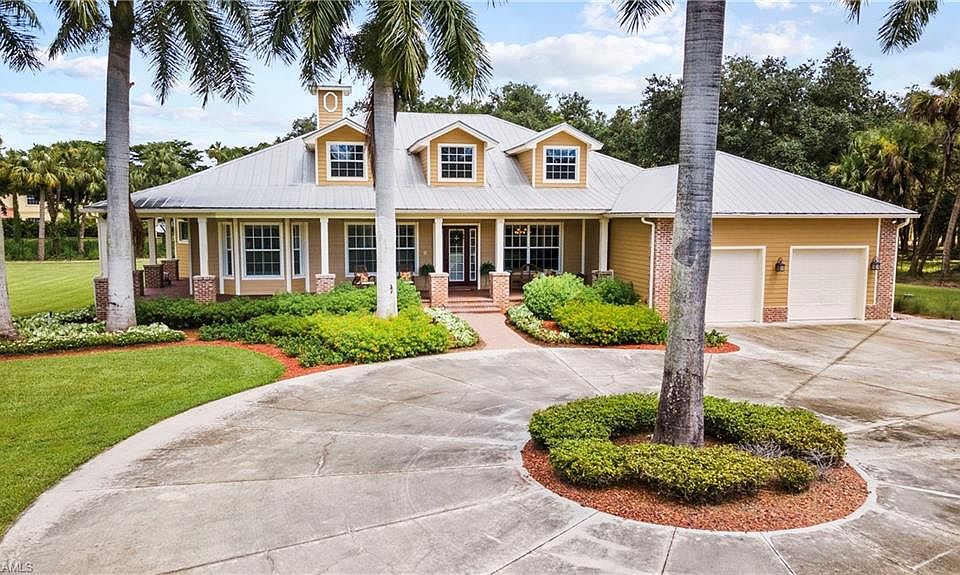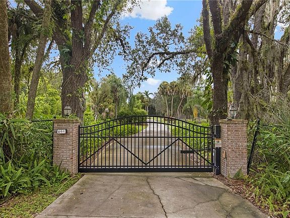 Now presenting this custom-built, rural estate that sprawls over almost 3 acres of meticulously maintained landscaping and mature oak trees. Complete with an iron gated entrance, this property provides total privacy for a relaxed lifestyle. Sip coffee in your rocking chairs on the Old-Florida style front porch or entertain by the resort style, saltwater pool and hot tub complete with a rock waterfall and in-ground fire pit. An updated chef's kitchen is the heart of this home, opening up to a traditional living room that entices you in with a fireplace, vaulted Cypress ceilings, and a built-in bar. Plantation shutters are throughout the 4 spacious bedrooms, office and den. There are 3 full bathrooms and one half bathroom, perfect for guests. Park your RV or boat under the detached garage that has covered parking, indoor storage, and 50 AMP to plug in. Great access to I-75, downtown Fort Myers, and Verandah's 36 hole private golf and country club. Schedule your exclusive showing today.