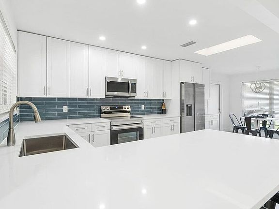 Priced to sell fast! Country Club living at its finest! Discover your dream home in the exclusive Eastpoint Country Club! This stunning 3-bedroom home has been fully renovated from top to bottom. Step into a designer kitchen featuring quartz countertops and brand-new appliances, perfect for your culinary adventures. You'll love the gorgeous new flooring and stylish lighting throughout, along with beautifully redone bathrooms. The home boasts abundant natural light, adding warmth and vibrancy to each room. An extra-large garage provides plenty of storage, and accordion shutters offer peace of mind. Roof has 14+ years of life left per 4 pt inspection, replaced in 2008. 2023 HVAC. Don't miss out on this gem!