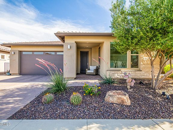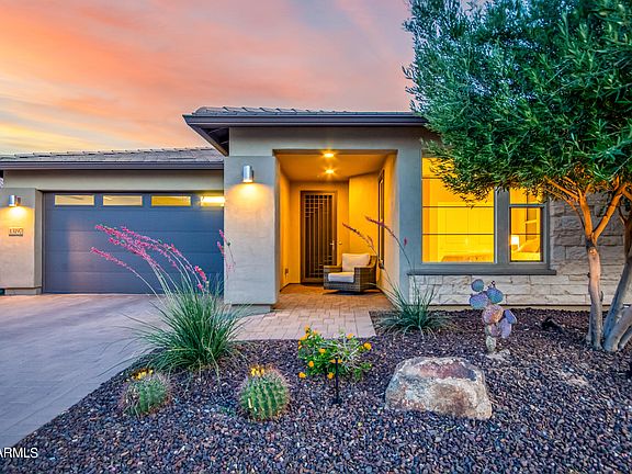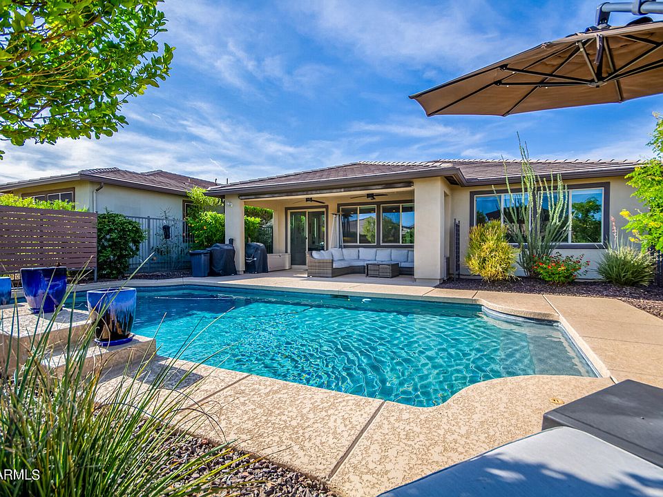 This BEAUTIFUL open concept VIBRANT w/over $200K in UPGRADES is move-in ready for you! Oversized 13 kWh OWNED solar for LOW APS bills! The PRIVATE rear-yard is your very own ''DESERT OASIS'' complete w/HEATED/COOLED pool, water feature, sun deck, oversized COVERED patio, SOLAR shade & MISTERS for year-round enjoyment! STEP inside to a gorgeous NEUTRAL palette w/WOOD look PLANK tile flooring, UPGRD carpets in B/rooms, DESIGNER lighting/ceiling fans thru-out. The CHEF'S kitchen features: UPGRD CABINETRY w/soft close doors & drawers, ENGINEERED STONE c-tops, tile B-Splash, S/S GE PROFILE APPL. incl. GE Monogram HOOD, pantry & OVERSIZED island. Spacious PRIMARY SUITE overlooks BEAUTIFUL R/Yard & features dbl. vanities, UPGRD shower w/FLOOR to CEILING tile including a spacious walk-in closet. The SPACIOUS Den/Office can be used as an additional guest room. This flex-space features DOUBLE doors, built-in cabinet for additional storage along with a custom built-in Queen size wall-bed unit w/bookcase. The laundry room features built in upper cabinets for your additional storage needs. The garage features a bump out which is perfect size for a golf cart, bike storage or hobby area. 50 amp electric car charger is already set up for your electric car charging needs. Additional upgrades: