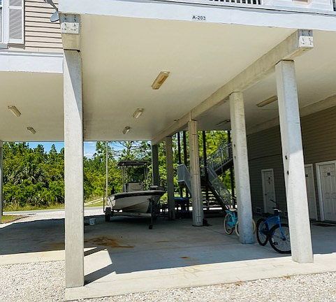 - Parking: Under House, 2 Car Attached Carport