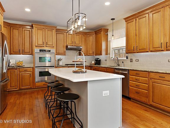 Mind-blowing new kitchen features exquisite granite countertops, a huge Caesarstone island, premium 42” cabinets, subway tile backsplash, under cab lighting and quality stainless steel appliances and generous eating area. Four large bedrooms (three with deep walk-in closets) include a delightful master retreat with oversized walk-in closet and luxury double vanity bath with deep soaker tub and separate shower. Gleaming 3” hardwood floors and 9’ ceilings grace the main level costarring a first floor den, pleasing open to kitchen family room, convenient mud/laundry room and formal living and dining rooms ideal for entertaining. The full basement provides 9’ ceilings and a rough-in bath for future expansion. Spanning over 3200 square feet above grade level and beautifully decorated throughout, this gem is set on a quiet double cul-de-sac with private yard and wooded views just blocks to train, town, and quality schools. Priced for a quick sale and ready for a fast closing. Call today to schedule your private showing.