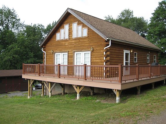 Newer log home on 1.75 acres. Newly finished timber-tech deck on 1/2 of deck; was going to convert rest of deck to porch. 17ft vaulted ceiling in great room, newly stained. Large walk-in closet in main bedroom. Radiant heating in basement.