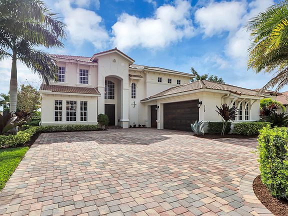 Gorgeous and immaculately maintained Stonegate model in Jupiter's most sought after community of Rialto! Picturesque waterfront view with desirable southern exposure. This open floor plan home boasts 6 beds and 5 full baths, gourmet kitchen with gas Wolf cooktop, and custom cabinetry. Crown molding, custom trim work, handmade custom window treatments throughout! Upgraded master bath with marble flooring and shower walls. When you walk through the entrance of this home you will immediately be greeted with 20 foot ceilings and a stunning one of a kind chandelier! Tropical backyard oasis with your own custom designed pool and hot tub sitting on a travertine paver patio, Tiki Hut, lush landscaping. Circular driveway, 1000 gal. propane tank (buried)!