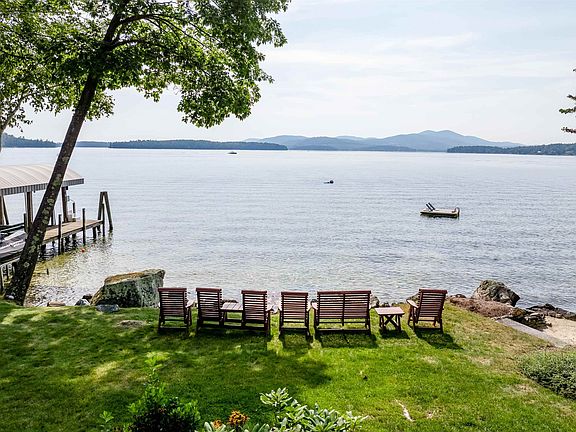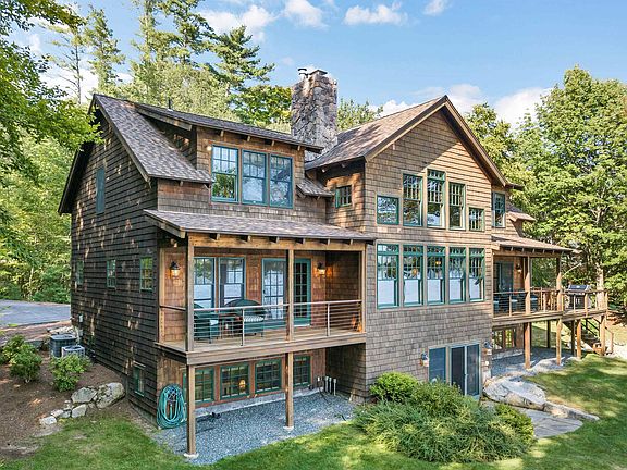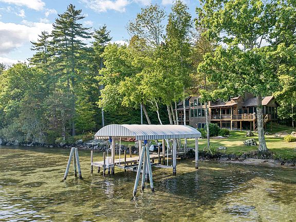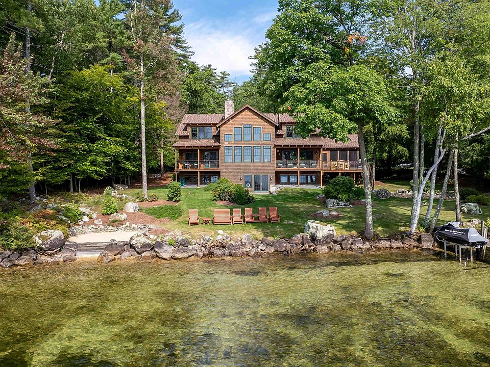 Offered largely furnished! This custom Adirondack-style lake home was designed by national award-winning architect Dann Norris Batting and sits on one of the finest lots you will find on Lake Winnipesaukee. At 2.34 acres, this lot is deep and private, with acreage extending across the street for added privacy. At the waterfront, the lakeside lawn is professionally manicured and slopes gently towards the water, offering plenty of room for recreation. There’s a perched sand beach that leads to a perfect sandy bottom for swimming, as well as a large dock with boat lift and canopy. The waterfront offers a sunny southern exposure. Perhaps best of all, long and expansive lake views extend all the way to the Belknap Mountain range – you’ll be hard pressed to find a better view anywhere on the lake! Inside, the great room has vaulted cathedral ceilings, floor to ceiling glass facing the lake, and a wood burning fieldstone fireplace. The chef’s kitchen is equipped with high-end stainless-steel appliances including a 6-burner Wolf gas range, wine cooler and large Sub-Zero refrigerator. A first-floor primary bedroom with ensuite offers views of the lake, and a walk-out onto an attached deck. There are views of the lake from almost every room in the home, 6 bedrooms in total and a finished lower level with walk-out to the lake. The oversized septic system can accommodate 7 bedrooms, leaving room for future expansion.