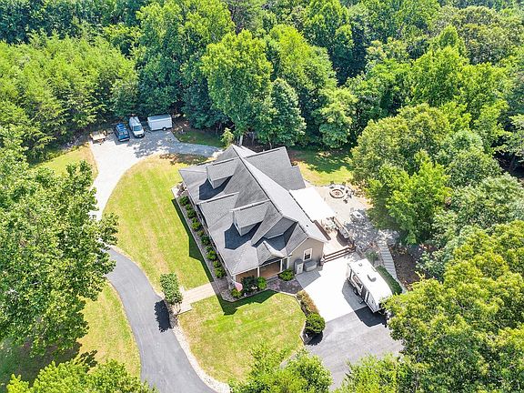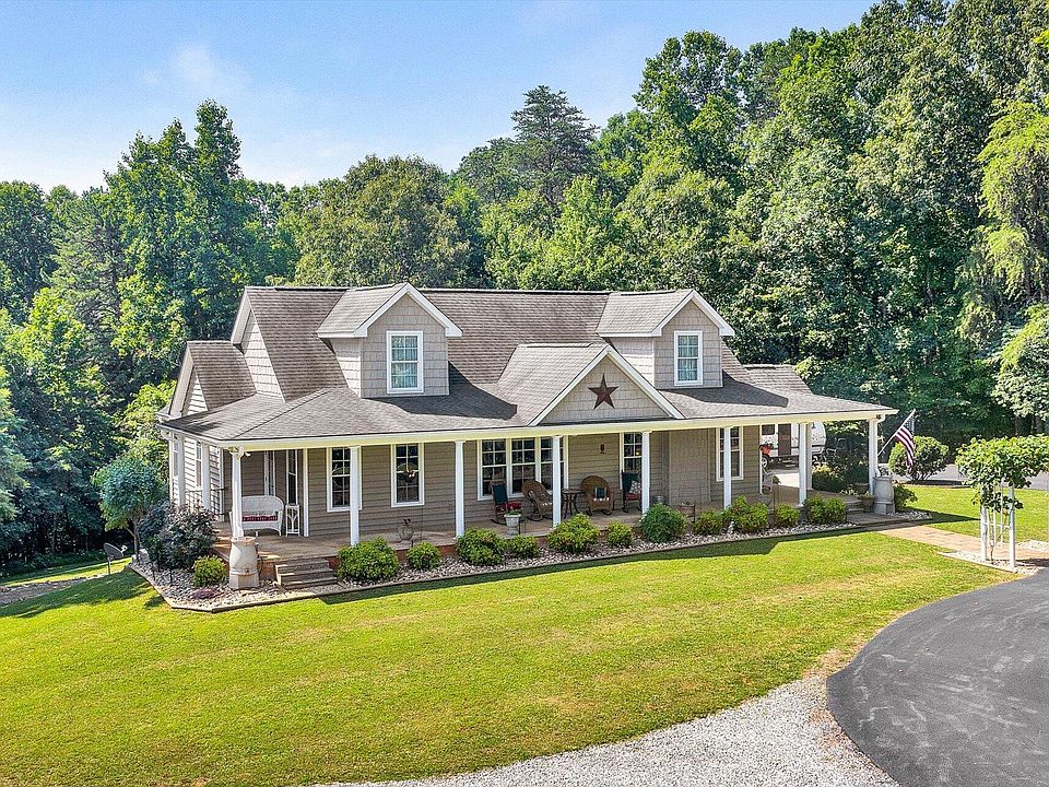 Privacy plus convenience...and no HOA! Come through the grape trellis and enter this lovely 3226 sq. ft. country/modern style home and you'll immediately feel the warmth of the welcoming, updated kitchen and the golden heart pine floors. Open floor plan in main living area, with a beautiful stacked stone fireplace accenting the living room. Large dining room for family meals. Spacious laundry area, guest bedroom and and master suite complete the main level. Lower level currently used as a large office, but has 2 additional bedrooms and a kitchenette and extra laundry area. Large wrap around porch for relaxing and enjoying the peaceful surroundings. Plenty of parking available on the 1.65 acre lot. Backyard has an extra large storage shed and chicken coop. Minutes from Copper Cove Golf Course, Westlake and Bridgewater Plaza. Lake access through ramp at Indian Point Marina, less than 1/2 mile away. See documents for list of recent improvements.