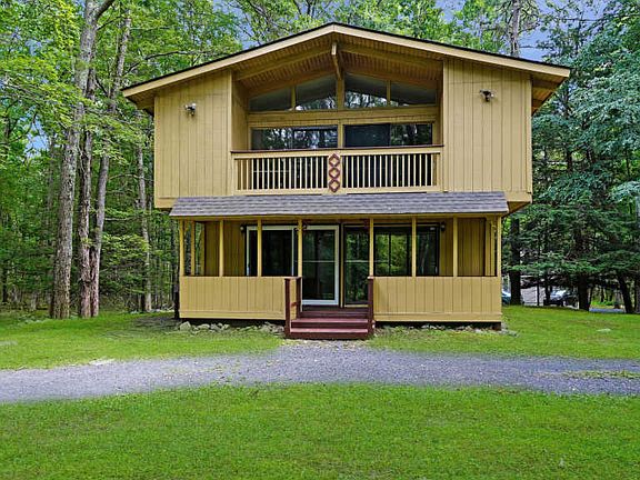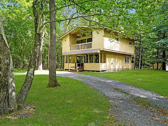 PERFECT POCONO RETREAT IN GATED, LAKE COMMUNITY! Located on a beautiful 1.35 acres, find this 3 bed (plus 4th bonus bedroom), 2 full bath, contemporary home featuring cathedral ceilings, intimate areas for family gathering, & the enjoyment of nature! Inside, find freshly painted walls, gorgeous laminate floors & wood ceilings. Main floor features an open, kitchen w/ living room /dining room combo & family room! SCREENED IN PORCH is the perfect spot for outdoor dining, morning coffee, & fun! Full bathroom main floor! Upstairs, high ceilings in every room! Full bathroom! Master bedroom w/fireplace! Amenities include 2 lakes, Seneca Lake & Conashaugh Lake. Fishing! Outdoor pool! Playground! Recreation Center! Basketball, tennis & Bocce court. Baseball field! Take the 3D Tour