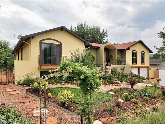 Such a cool property in Manitou Springs! Spanish style stucco home with vaulted, becamed ceilings and great room concept. Views of Garden of the Gods and the city! Minutes from downtown! Engineered hardwood floors! Remodeled kitchen with granite counters, stainless steel appliances and large island. Large dining area walks out to courtyard located in the center of the house. The Courtyard is the focal point and perfect for outdoor entertaining. Hot tub is included. Xeriscaped yard with tons of perennials, garden Apple, peach and pear tears and a putting green. Main level master with remodeled bath walks out to courtyard also. This home also has a cozy sunroom. Basement includes a workout area/home gym. HUGE workshop area or room to grow in the unfinished basement. Almost all of the windows have been replaced. Main level laundry.