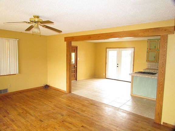 Well built frame home with brick and lap-side exterior with good (commercial grade) propanel roof on three lots. Within walking distance to schools and downtown Cimarron. Has spacious back yard with shed for storage and hook up for your friends RV. The bedrooms are decent sized and living room/kitchen has been opened up to great effect. Nice hardwood flooring and deck off the back make this a home to live in and enjoy. Views of the mountains in a pleasant quiet neighborhood. 6 foot privacy fence around entire back yard.