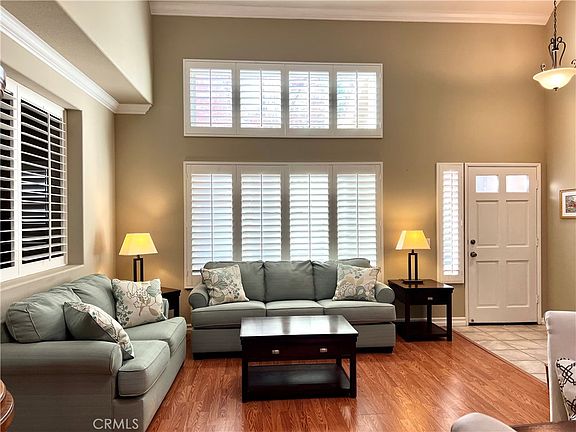 Throughout the home, plantation shutters and updated dual-pane windows enhance both aesthetics and energy efficiency. This end unit includes an attached two-car garage and additional nearby parking within the complex. Other notable features include recessed lighting, an updated thermostat, a recently replaced Lennox air conditioning system and furnace, and elegant crown molding. The property's location offers easy access to freeways, shopping, and award-winning schools.