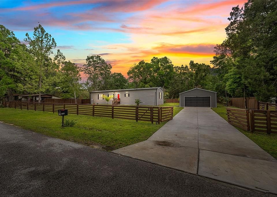 Motivated Seller....bring all offers!!! Rare opportunity for this Newly built in 2022 manufactured home with 9’ high ceilings in just under half an acre and completely fenced yard with stained wooden fence and a gate. Oversized detached metal garage 22’ x 25’ with a metal roof and epoxy flooring. Offering options for parking, storage, workshop, and plenty of space for an RV or boat! This home has drywall walls on the interior of the home, beautifully decorated like a model home with attention to every detail. From the second you walk in, you feel at home! Split floor plan of 1140 sf of living space, vinyl flooring throughout with the exception of the bedrooms where there is carpet, kitchen has a nice island w/butcher block looking top and storage underneath, stainless steel appliances including a farm style sink, built in desk, pretty backsplash, living/dining combo with sliders to the back, laundry room with stackable washer/dryer, master bedroom is a nice size to fit a king size bed comfortably, en-suite has a half block glass wall with decorative tile in shower and a bench in the shower stall, and a Walk in Closet. Private backyard and there are plenty of fruit trees on the property as lemon grass, mango, lemon and banana. Also, pavers from home to the garage, downspouts and gutters too!! Please schedule your showing before it’s gone!