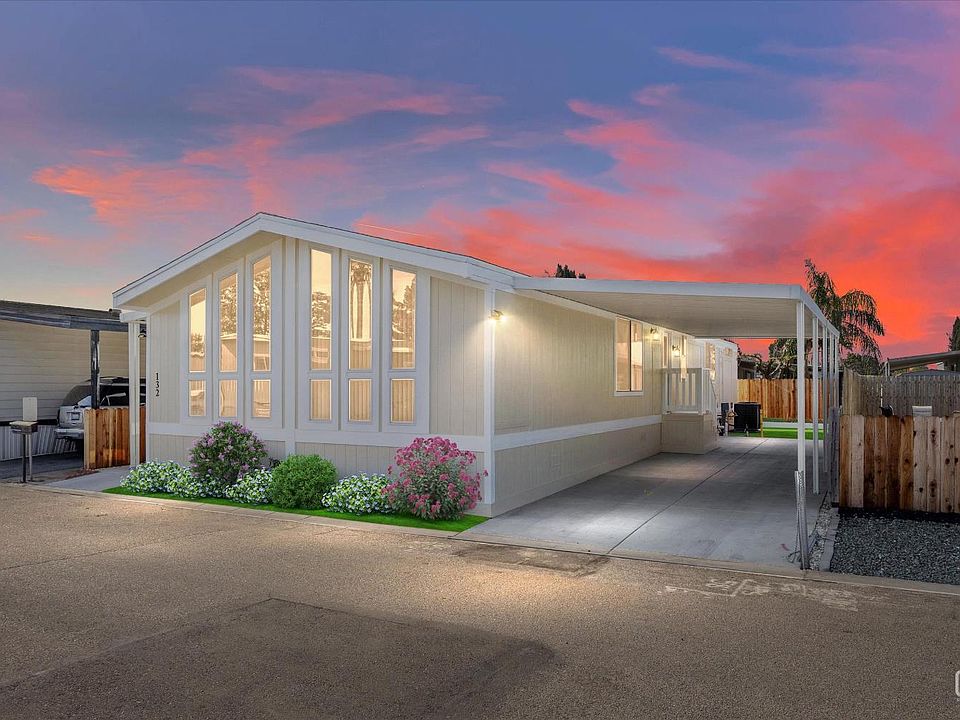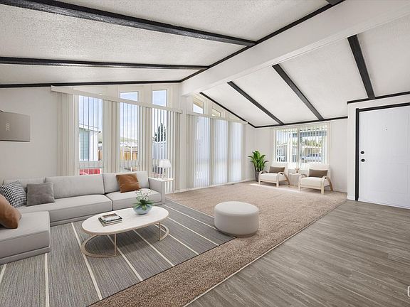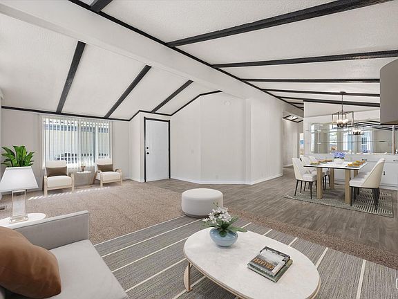Experience modern sophistication in this 1,536 sq ft manufactured home boasting 3 bedrooms and 2 bathrooms. Large front windows flood the interior with natural light, drawing attention to the stunning black beam accents and recessed lighting that enhances every space. The sleek kitchen is outfitted with sleek appliances, while a smart storage solution with a built-in mirror near the dining area adds both style and functionality. In the bathrooms, modern black mirrors and contemporary light fixtures create a refined atmosphere. Enjoy premium community amenities such as a sparkling pool, gym, game center, soccer and basketball courts, and a clubhouse with a full kitchen and recreational room. There's even a playground and dog station, ensuring delight for every family member. This home combines comfort with a vibrant community lifestyle. The vibrant neighborhood ambiance ensures that you will not only enjoy your home but also a dynamic and engaging community experience.