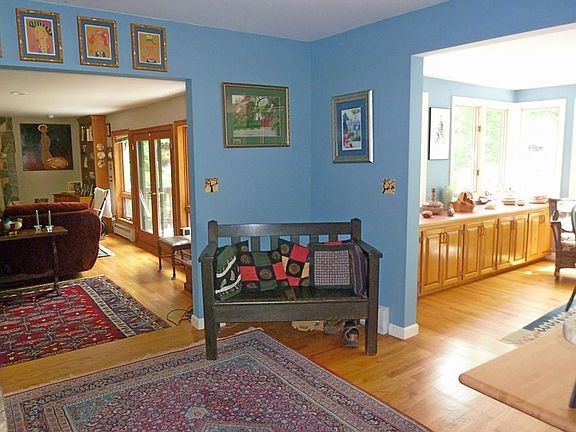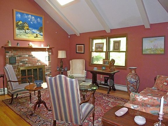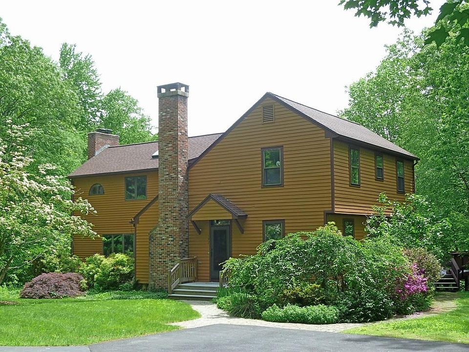 Nature surrounds this contemporary saltbox. Versatile floor plan features a vaulted living room with a fireplace, spacious family room with an exquisite stone fireplace and built-ins; renovated kitchen with granite counters and custom cabinets opens up to sunny dining room with windows on three sides and access to the large deck. Master bedroom suite has french door to balcony, cathedral ceilings, large walk in closet, fireplace, and tiled bath with separate shower and jacuzzi. Fourth bedroom on 1st floor could also be office. Oak floors throughout the first floor, and finished playroom with 1/2 bath in the basement has new laminate flooring. 6 zone Buderus heat and hot water, and new oil tank. Two year old roof, and a garden shed under the deck as well as a large shed out in the yard.