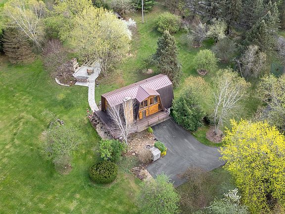 Looking for tranquility, yet still close to all the amenities you need? This exceptional property offers the perfect blend of peace and convenience. Set on 4 picturesque acres in Bellefonte, this quality-built chalet is a true retreat where nature and comfort come together effortlessly. Step inside to a kitchen adorned with granite countertops, stainless steel appliances, and rich Brazilian Koa hardwood floors. The open-concept layout flows into an inviting vaulted living room with a cozy wood-burning fireplace, and sliders that open to the deck for easy outdoor access. The main level also features two bedrooms and a full bathroom. Upstairs, a generous loft offers panoramic views of Purdue Mountain, making it an ideal space for work, reading, or quiet reflection. The upper level is completed by a spacious primary en suite, featuring lovely views and direct access to the balcony. Outdoor living truly shines with a thoughtfully designed patio that boasts a striking sandstone fireplace, a built-in bar complete with granite countertop and pre-wired for cable. Additional features include a 2-car garage, a storage shed, mature fruit trees and garden beds. Whether a full-time retreat or the perfect weekend escape, this peaceful mountain haven is designed for making lasting memories and ready to welcome you home.