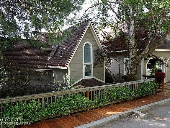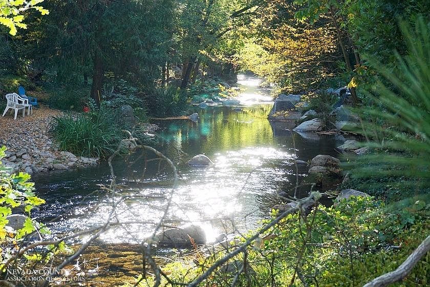 Charming Grove St home on Deer Creek, Nevada City. Design captures aura of creek with tall windows, glass doors, views from every level. Cheery entry. Living room has 2 sets of glass doors to deck, 2 skylights, 3 tall window insets. Diagonal oak floors, red ceramic stoves in open living, dining, kitchen level. Alderwood kitchen cabinets, granite counters, 5-burner gas range, inviting window seat, breakfast bar, built-in china cabinet. Delightful plan steps down to entry, down to daily living, up to bedrooms & office. 3 private bedrooms on 2 levels. 3 baths. Office or bonus room. Home highlights creek. Laundry off kitchen w/generous cabinets, sink,storage, outside door. Large deck, stepping stones to creek. Small pond by lower patio, outside garden room. Lovely creek scene, with your own deep pool. Attached 2-car garage. New wooden sidewalks add more charm.