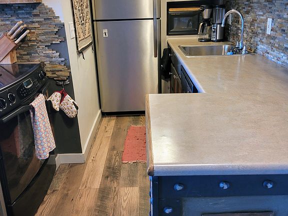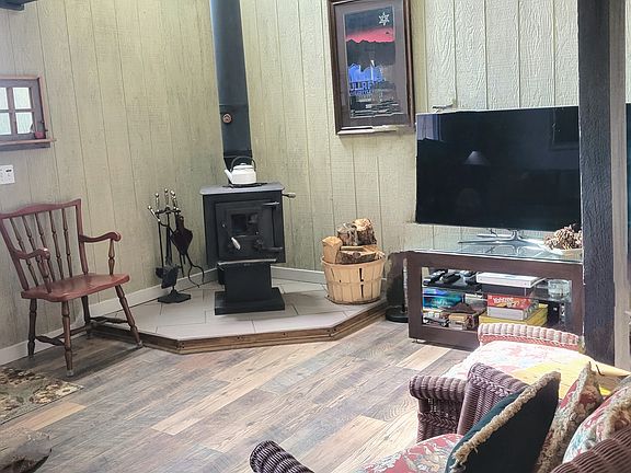 Entry level includes Livingroom, Dining area and designer kitchen with wood plank flooring and a cozy woodstove. Off the kitchen is a private bedroom with a queen, desk, tv, closet and full bath with tub/shower and a 2nd entry door.