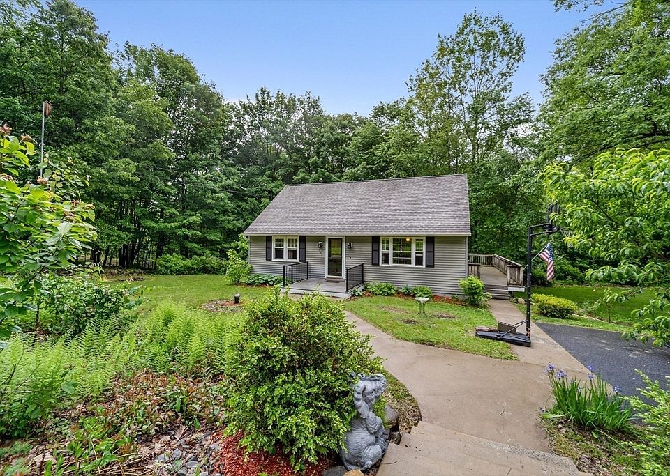 Looking to get away from the hustle and bustle of city life and own your own little oasis! This 3-4 bedroom cape boasts a yard with fruit trees, including peach, pear, and cherry trees, a strawberry bed, concord grape, wild raspberry and blackberry bushes, fire pit and a variety of birds. The open floor plan inside includes the kitchen open to the living room for easy entertaining. Eat in kitchen includes subway tile backsplash, granite countertops, recessed lighting and exterior access to wrap around trek deck. The first floor bedrooms offer hardwood floors. Second floor office is currently being used as a bedroom, with a half closet.The full, walk out basement is open for your own remodeling ideas. This home combines privacy plus a neighborhood setting!!