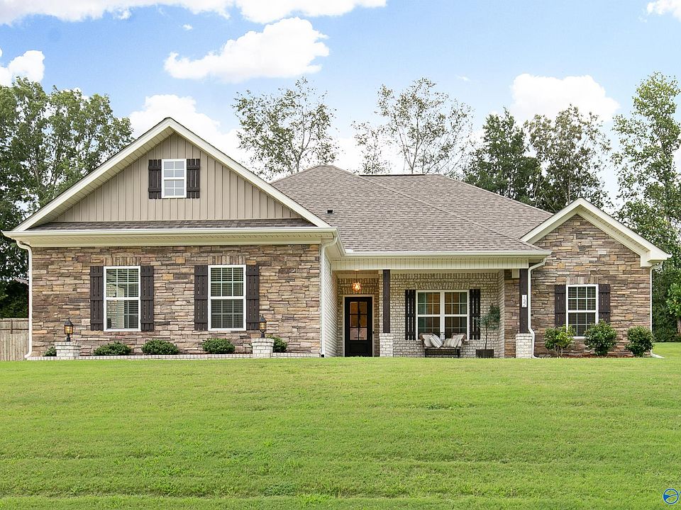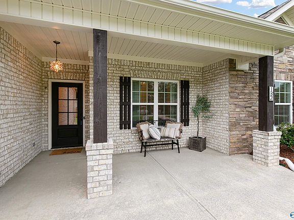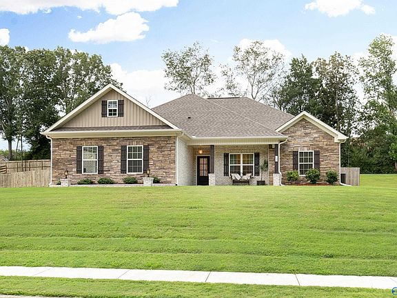 Gorgeous Full Brick and Stone 4 bedroom, 2 bath home is move-in-ready & has a private fenced backyard! From the extensive wood trim to the granite in the kitchen & bathrooms, this home is filled with luxury and style! The living room is open to the kitchen and features a gas log fireplace! The eat-in kitchen is large and dressed with white cabinets, granite, subway tile, stainless appliances, & recessed lighting! Enjoy LVP in all bedrooms. The isolated owner’s suite is spacious and features a glamour bath with a large walk in closet. Spend your free time relaxing on the covered front porch & covered rear patio! 2 Car Side Entry Garage. Conveniently located to Huntsville & Madison! MUST SEE!