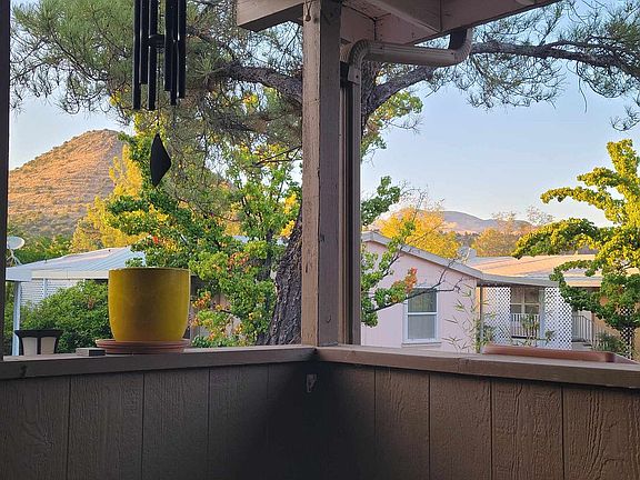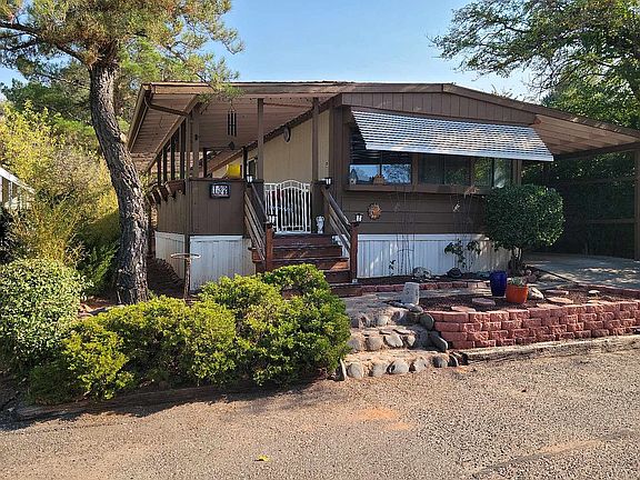 Beautiful home in Sedona Shadows, Sedona. Lot rent is $1196. This is not a single wide home it is an one and a half wide 14' wide. An age qualified community (over 55). 5 min walk to National Forest for hiking and biking. Home has no one behind it for added privacy. Large covered deck on side with mountain views. New deck and stairs on driveway side. New steps to large deck. Newer fridge, gas stove, hot water heater and heat pump. Inside this home is lovely. New vinyl planking laminate throughout (excluding guest room). New paint, curtains, LED lights throughout. New ceiling fans in master bedroom and living area. Woodburning fireplace for those chilly evenings. Bedrooms are located at either end of house with bathrooms, great for guests or roommates. Community has pool, hot tub, fully equipped fitness center, and barbecue area. Don't miss out as this is priced to sell. Just unpack and enjoy.