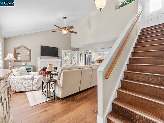 Vaulted ceilings and shutters fill the living areas with natural light. The first level includes living and dining spaces, complete with a gas-burning fireplace in the living room, perfect for gatherings. The kitchen is beautifully updated with solid surface countertops, ample storage, a spacious island, a built-in double oven, and a gas-burning cooktop. A window above the sink offers views of the Clayton hills. The dining room and living room connect to the wrap-around backyard, creating an inviting space for gardening and gatherings. The first floor also features a versatile bedroom, ideal for an office space, a full bathroom, and convenient access to the garage. Upstairs, you'll discover three more bedrooms and two full baths, including a primary suite with mirrored closet doors and a private bathroom. Solar panels ensure year-round energy efficiency. With an attached garage offering interior access and a fenced side yard, convenience is at your doorstep. Enjoy suburban living with easy access to fabulous restaurants, downtown Clayton, meandering trails, and Mt. Diablo State Park.