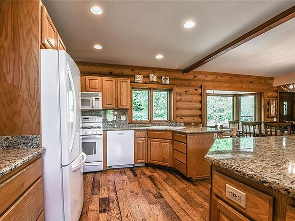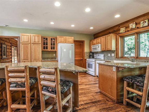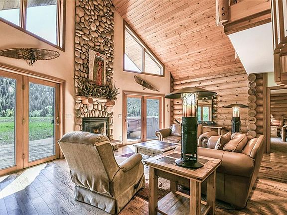 Well maintained custom log home with 3BR/2BA + loft on sunny 4.4 beautifully landscaped acres & pond, aspen-lined creek & log bridge just 7 miles north of town. Enjoy gorgeous views from expansive, wrap-around deck & hot tub. Open, inviting floor plan, granite slab kitchen counters, custom wood cabinets, spiral staircase, radiant heat & fireplace. All main floor bedrooms with huge windows and doors to deck. Incredible patio with outdoor fire pit perfect for entertaining. Detached 3-car garage.