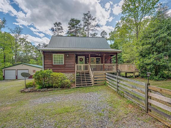 If you've dreamed of a private cabin in the woods, DON'T MISS this adorable 3+ acre property in Rutherfordton! Cozy & inviting, this true stacked log home in Emerald Lake feels like a wooded paradise. Exterior features include wrap-around covered porch/deck, double garage w/insulated heated & cooled workshop, fenced back yard, & hookup for whole-house generator. In-ground gas grill plus a spacious cleared field w/scuppernong & muscadine grape vines that's plenty big enough to add a garden. Adorable guest cabin w/full bath, LVP flooring, propane wall heater plus an electric fireplace & window a/c. Head inside & you'll find everything you need on the main level. Primary suite w/built-ins & office area, open concept living room w/stone fireplace, dining area w/slider to deck, kitchen w/breakfast bar & laundry closet. Upper level offers bonus/potential bedroom w/full bath & walk-in closets plus another bedroom w/engaging views of back pasture. Most furnishings convey.