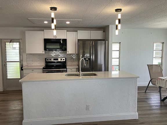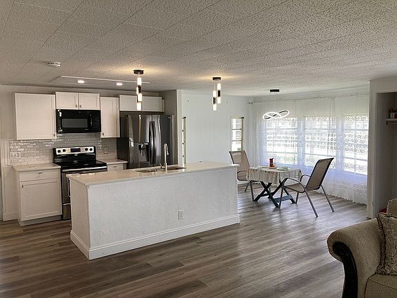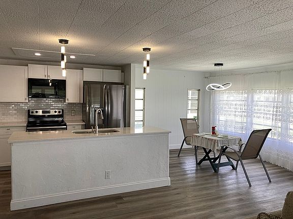 Located in Orange Harbor, a 55+ Gated Community, this RENOVATED HOME comes with all you need including NEWER flooring throughout, NEWER Stainless-steel Kitchen Appliances & NEWER cabinets. With an impressive 1080 sq ft of space, the open concept Kitchen features an Island that overlooks the living or dining room area and offers tons of natural light as well as lots of recessed lighting. Other appliances include washer and dryer set. The upgrades do not stop there, bathroom has been completely remodeled and has a very modern look, with NEWER countertops, NEWER fixtures and much more. The master and guest bedrooms offer lots of space and windows to let that beautiful Florida sun to welcome your day. The Enclosed porch overlooks the lovely landscaping, the perfect spot for morning coffee and sunsets. Additional outdoor amenities include multiple outdoor seating areas, including a covered porch underneath the carport and patio, perfect for entertaining your out-of-town guests. With a storage shed & a spacious carport & driveway, enough space for 2 vehicles, what else can you ask for. Do not miss out on this amazing opportunity and come see this home for yourself!