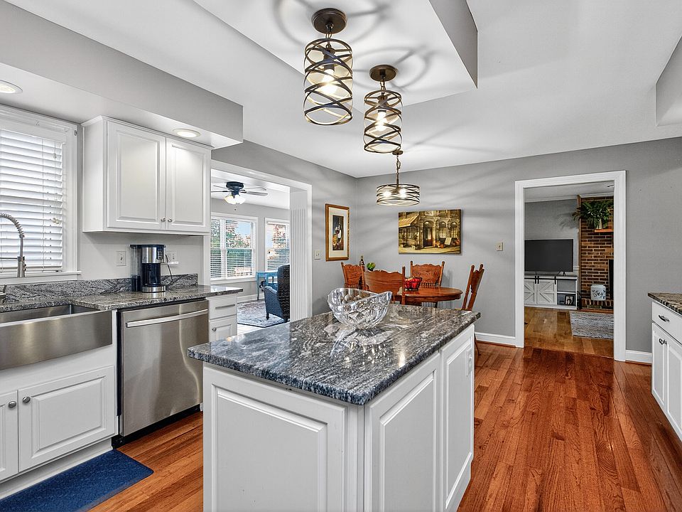 Beautifully updated kitchenFlexible living optionsWood-burning stoveBuilt-in wet barEnclosed porchGranite countertopsCustom cabinetry