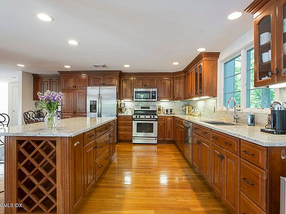 5 Bedroom, 4.5 bath Riverside home. Beautiful kitchen sep breakfast room & adjoining FR and deck. Sun-filled, versatile floor plan. Hardwood floors throughout. First floor BR bath or office/gym, master (en suite bath plus 2 family BRs & bath on second floor. Walk-out LL FR, BR, bath - ideal in-law suite, visitors or au pair - opens to stone terrace & beautifully landscaped, fenced grounds sprinkler system. Wonderful location, walk to RR, Riverside schools and shopping. Not to be missed