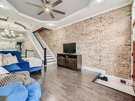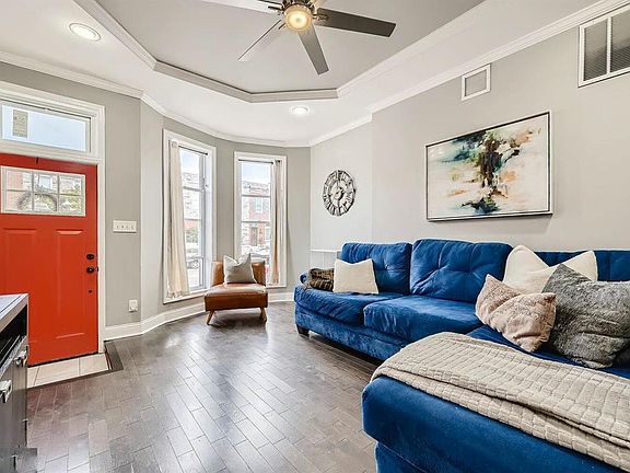 Discover this exceptional, fully renovated townhouse featuring 3 bedrooms and 3.5 bathrooms, ideally located just minutes from Canton, the waterfront, and Patterson Park. As you open the bright, freshly painted front door, you'll immediately feel at home in this inviting space. The exposed brick and hardwood floors throughout preserve the home's original charm, while modern updates enhance its appeal. The open-concept living area is bright and airy, showcasing recessed lighting, high ceilings, elegant crown moldings, and striking custom tray ceilings. Each room offers a unique architectural design: the living room is elegantly octagonal, the dining room is round with a central chandelier, and the kitchen is a spacious rectangle highlighted by four pendant lights. The seamless flow from the living room to the dining area makes this space perfect for entertaining. The kitchen is a chef's dream, featuring stainless steel appliances, two-toned cabinets, marble countertops, and subway tiles with a glass inlay. The oversized stainless steel farmhouse sink and large island complete with a wine fridge and seating for four add to its functionality. Adjacent to the kitchen, you'll find a mudroom and a convenient half bath. The finished lower level includes the first of three bedrooms, a generous family room, a full bath with a walk-in shower and a basket weave tile floor, a large laundry room, and ample storage closets. The primary suite on the second floor is a luxurious retreat, with an octagonal tray ceiling, recessed lighting, a large walk-in closet, and a private EnSuite featuring a vessel sink, a walk-in shower with a built-in seat, and a stunning waterfall tile design. A full bath with a vessel sink vanity and a second spacious bedroom are also on this floor, with access to a cozy deck and stairs leading up to a rooftop deck with spectacular city views. From the kitchen, step out onto a spacious wood deck that overlooks a fenced yard, complete with a patio and parking. This home offers a blend of classic charm and modern convenience, ready to welcome you. Owner pays for water and will be added to the rent bill every month (bills will be shared with tenant when issued by the city). Renter pays electricity, gas, cable, internet etc. Pets allowed with a deposit, monthly pet fee plus tenant is responsible for any repairs due to damage. No smoking on premises allowed
