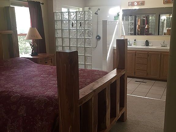 Lovely home in quiet neighborhood with tree farm bordering backyard. Huge deck with covered hot tub. Remote access garage door opened with covered access. Master suite has en-suite walk in shower with glass block surround. Remodeled master with built in closets. Gas fireplace for ambiance and heat, plus central heating and cooling. Cozy place in the pine trees. Owners will be leaving riding lawn mower and snow blower.
