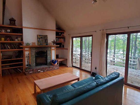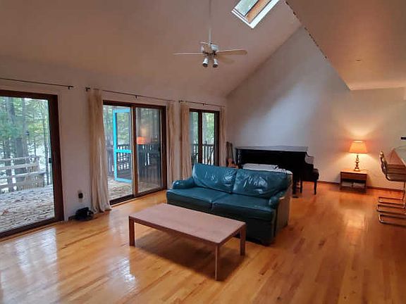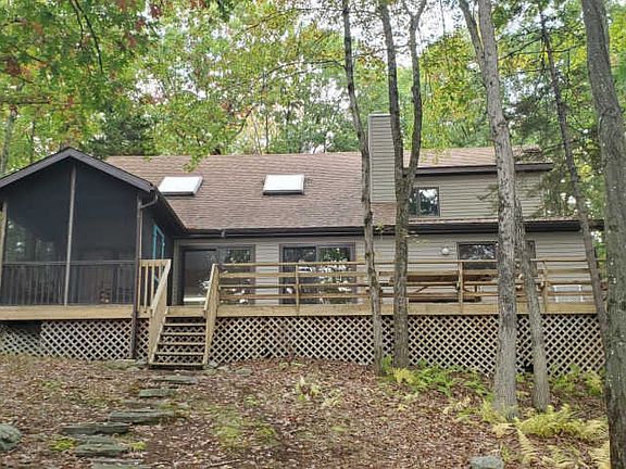Four Bedroom Lakefront home with features that include a master suite on the first floor, open floor plan, cathedral ceilings, skylights, screen porch and large back deck overlooking the lake. Enjoy the long grassy and wooded driveway to the house and the grassy wooded area between the house and the lake...set on .82 acres. Super setting, great fishing & swimming! Enjoy pocono lakefront living!