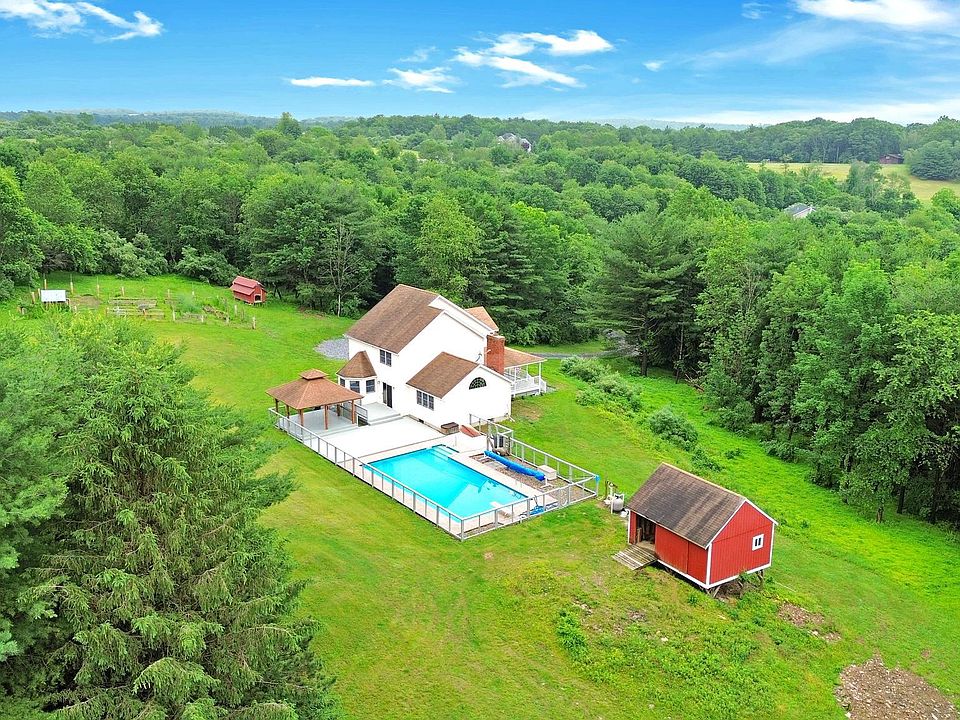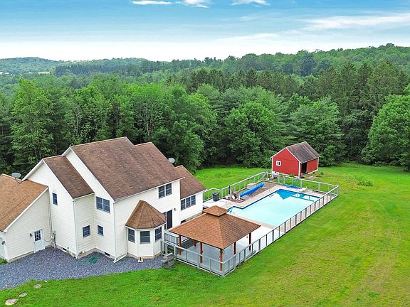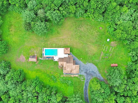Your very own 12 ACRES of total privacy! This 3-4 Bedroom colonial home is move-in ready to start enjoying country life. Leading up along driveway opens up to a spacious yard surrounded by a tree border, a small barn, chicken coop and gardens. Soak in the outdoors on the patio at the INGROUND POOL along side the large decks and pavilions, or adorn some rocking chairs on the huge covered front porch. Inside welcomes you into a Great Room with cathedral ceilings, surrounded by windows overlooking your private yard, wood/coal stove with new liner, and modern refinished hard wood floors and fresh paint throughout the ENTIRE home on both levels! The spacious kitchen with an abundance of storage, center island, double wall ovens and breakfast nook with vaulted ceilings, wood accent ceilings, and dining room with sliding doors to the outdoor entertainment space. Large main floor bonus room, perfect for working from home or guest room and full bathroom. Primary Bedroom Suite has TWO walk-in closets and updated en-suite bathroom with dual sinks, granite counters and modern tile. Each room bedroom is generously sized and has Walk-in Closets and ceiling fans! Finished lower level to make a game room, workshop or additional living space. An abundance of space inside and out! Schedule today to view this extraordinary property in person! Ask how to receive a $4,000 lender credit towards closing costs or lowering your interest rate!