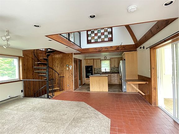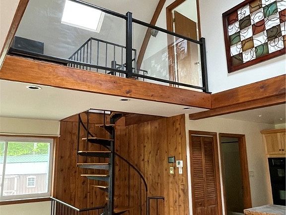 Located in Schoharie county, just a half mile from the Village of Jefferson, sits this 1100 square foot home in the woods. Accessed through a right of way at the end of a private road, your peaceful oasis awaits. The hideaway sits on 15.69 surveyed acres with woods for hunting, trails, open green space and a beautiful view. The main first floor offers upgraded kitchen. With propane countertop range, wall oven and microwave combo with stainless refrigerator and dishwasher. Open living and kitchen area is great entertaining space with bonus room. One bedroom with full bath on the lower level with washer and dryer. Two bedrooms with private balconies on the second floor. Radiant floor heating in parts of the house.