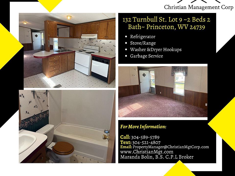 132 Turnbull St. Lot 9 ~2 Beds 2 Bath~ Princeton, WV 24739 LEASE OPTION (Path to Home Ownership): Initial payment: $1,000 with no payments due until the 1st of the following month! Monthly payment: $595/month includes lot rent and trash service. or RENTAL: Security Deposit: $595. Can be made in payments if needed. Monthly payment: $595/month includes lot rent and trash service. Sorry, this home is not HUD approved. Large 16 wide 2br/2ba mobile home. This oversized single wide is located in Pinetree mobile home community in Glenwood, WV. The mobile sets on a semi private lot with no mobile homes behind it. Brand new underpinning and porches. Central heat & air. Extra closet space. Move in ready! Christian Management Corporation Office Hours: Mon-Fri 9:00AM-5:00PM & 10:00AM-2:00PM the 1st Saturday of every month You can view THIS property 7 days a week! Most pets welcome with a $200.00 pet fee per pet and signed pet agreement. Maximum 2 pets. No aggressive breeds due to insurance restrictions. Clean, safe, quiet, crime & drug-free are our priorities for our residents! We support Equal-Housing Opportunities! Good people with good, bad, low, or no credit but stable employment or Social Security are welcome. Criminal Checks: -NO recent felonies in the last 7 years -NO evictions in the last 7 years -NO sex offenders Is this property not what you are looking for? ChristianMgt.com!