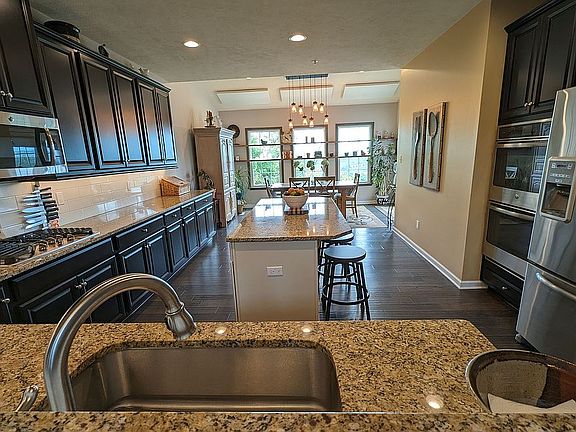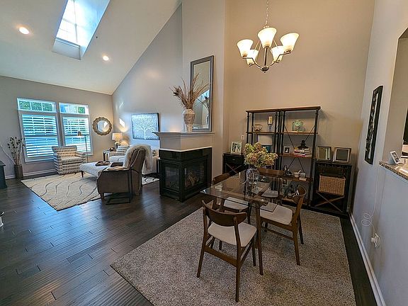 Enjoy low maintenance living in this 4 bedroom/ 3-1/2 bath villa with finished basement, and attached 2-car garage in the sought-after Sunset Pointe neighborhood. Impressive entry into the vaulted ceiling great room with gas fireplace that’s shared with an open dining area. Elegant staircase leads to an upstairs loft, two guest bedrooms and full bath. Custom plantation shutters adorn the living room and home office windows. Large morning room with an expansive exterior view and patio door leading to a large deck with gas fire pit. Impressive gourmet kitchen includes stainless appliances, double wall ovens, gas cooktop, 42" cabinets, large island, subway tile backsplash, pantry, & granite countertops. Spacious 1st floor owners’ suite includes two walk-in closets, bath with large glass-enclosed shower, quartz counter with his/her sinks, and garden tub. Engineered hardwood floors and 36” wide doors throughout the main level with ceramic tile floors in bath and 1st floor laundry. Rear Azek deck and lower level screened-in porch with 5-person hot tub offer a fully private, wooded view. Enjoy entertaining in the wonderful walk-out lower-level game room, which includes patio doors to the screened porch and fenced side yard, home theater with 120-inch screen, spectacular wet bar with quartz countertops, beverage refrigerators and microwave oven. Additional lower level cabinets provide extra storage. Lower level bonus room can be used as exercise space or additional guest quarters.