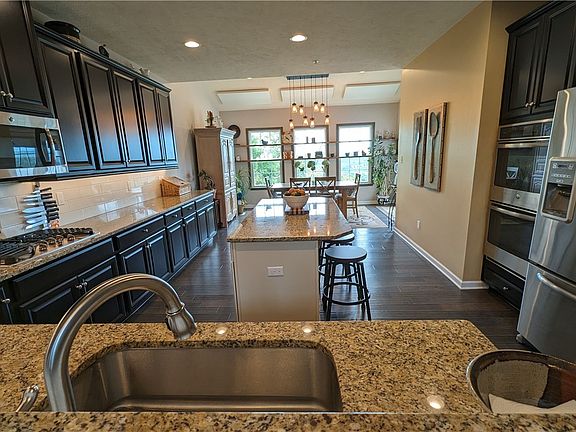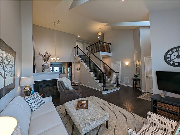 Enjoy low Maintenance living in this Luxurious 4 bedroom / 3 1/2 bath villa with finished basement and attached 2 car garage in the sought-after Sunset Pointe neighborhood. Impressive entry into the vaulted ceiling great room with gas fireplace that's shared with an open dining area. An elegant staircase leads to an upstairs loft, two guest bedrooms and a full bath. Custom Plantation shutters adorn the living room and home office windows. Large morning room with an expansive exterior view and patio door leading to a large deck with gas fire pit. Impressive gourmet kitchen includes stainless app., double wall oven, gas cooktop, 42" cabinets, island, subway tile backsplash, pantry, & granite Countertops. Spacious 1st floor Master includes two walk-in closets, bath with glass-enclosed shower, quartz counter top double sink, and garden tub. Rear Azek Deck and lower level screened porch with 5-person hot tub. Fully finished basement with a 120-inch theater screen, wet bar with quartz top.