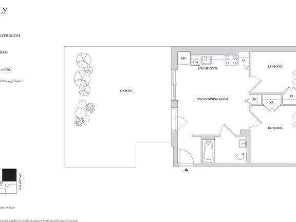 Mid-May occupancy available. Experience Modern Comfort in 132 Waverly Avenue's Stylish Two-Bedroom Unit with Private Outdoor Garden Be among the first to visit unit #1B, a sophisticated two-bedroom / one-bath home with expansive private outdoor garden at 132 Waverly Avenue, Clinton Hill's newest boutique rental development. Bathed in natural light through oversized windows, the open design of the living and dining area provides ample space for both relaxing and entertaining. The open kitchen offers a continuous flow and loft-like experience with its connection to the living room. The kitchen has generous cabinet and counter space for those who love to cook and entertain. A unique feature, #1B has a spacious private garden perfect for outdoor seating and lounging. Whether entertaining guests with an al fresco meal or enjoying a cup of coffee, you can bring the comforts of the outside to your home. The living room and bedroom closets, offer ample hanging space. The primary bedroom can easily accommodate a queen-size bed, offering a cozy and spacious retreat. Bedroom closets are equipped with custom shelving systems to maximize storage and organization. the second bedroom is steps away from the second bathroom and has its own ample closet space. Located on vibrant Waverly Avenue, 132 Waverly offers an intimate living experience amidst the dynamic Clinton Hill neighborhood. Whether staying in or exploring the local scene, you'll have the perfect space to stretch out and relax at home or venture out to discover your new favorite neighborhood spots. All homes feature sound-attenuated windows, in-unit washer and dryer and a stainless-steel appliance package. The kitchens are equipped with custom cabinetry, complemented by Pure White Caesarstone countertops. Bathrooms are condo-quality, offering deep soaking tubs, with custom vanities providing generous storage space. Every room comes with preinstalled solar shades, ensuring these apartments are truly move-in ready. Amenities Include: Fitness center Private resident courtyard Resident lounge w/private and group work-stations Roof deck with grilling stations, tanning lounges, group seating and outdoor shower Private storage cages Bike storage *Renderings and/or photos may not be of the actual unit and are for illustrative purposes only. Upfront/Required Fees: Application Fee: $20 per applicant. One Month Rent: Due at signing. One Month Security Deposit: Due at signing (Refundable) (Reduced security deposit offers may apply) Utility Fees: All tenants are responsible for setting up a ConEd account prior to signing and for the associated utility fees based on usage Optional Fees: Please inquire about our pricing and fees related to our optional services including access to the Bike storage.