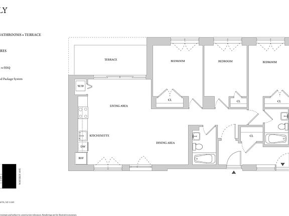 Mid-May occupancy available. Experience Modern Comfort in 132 Waverly Avenue's Stylish Three-Bedroom Unit with Private Outdoor Space Be among the first to visit unit #4A, a sophisticated three-bedroom / two-bath home with expansive private outdoor space at 132 Waverly Avenue, Clinton Hill's newest boutique rental development. Bathed in natural light through oversized windows, the open design of the living and dining area provides ample space for both relaxing and entertaining. The open kitchen offers a continuous flow and loft-like experience with its connection to the living room. The kitchen has generous cabinet and counter space for those who love to cook and entertain. A unique feature, #4A has a spacious private balcony perfect for outdoor seating and lounging. Whether entertaining guests with an al fresco meal or enjoying a cup of coffee, you can bring the comforts of the outside to your home. The living room and bedroom closets, offer ample hanging space. The primary bedroom has an en-suite bathroom and can easily accommodate a queen-size bed, offering a cozy and spacious retreat. Bedroom closets are equipped with custom shelving systems to maximize storage and organization. Second and third bedrooms are steps away from the second bathroom and each has its own ample closet space. Located on vibrant Waverly Avenue, 132 Waverly offers an intimate living experience amidst the dynamic Clinton Hill neighborhood. Whether staying in or exploring the local scene, you'll have the perfect space to stretch out and relax at home or venture out to discover your new favorite neighborhood spots. All homes feature sound-attenuated windows, in-unit washer and dryer and a stainless-steel appliance package. The kitchens are equipped with custom cabinetry, complemented by Pure White Caesarstone countertops. Bathrooms are condo-quality, offering deep soaking tubs, with custom vanities providing generous storage space. Every room comes with preinstalled solar shades, ensuring these apartments are truly move-in ready. Amenities Include: Fitness center Private resident courtyard Resident lounge w/private and group work-stations Roof deck with grilling stations, tanning lounges, group seating and outdoor shower Private storage cages Bike storage *Renderings and/or photos may not be of the actual unit and are for illustrative purposes only. Upfront/Required Fees: Application Fee: $20 per applicant. One Month Rent: Due at signing. One Month Security Deposit: Due at signing (Refundable) (Reduced security deposit offers may apply) Utility Fees: All tenants are responsible for setting up a ConEd account prior to signing and for the associated utility fees based on usage Optional Fees: Please inquire about our pricing and fees related to our optional services including access to the Bike storage.
