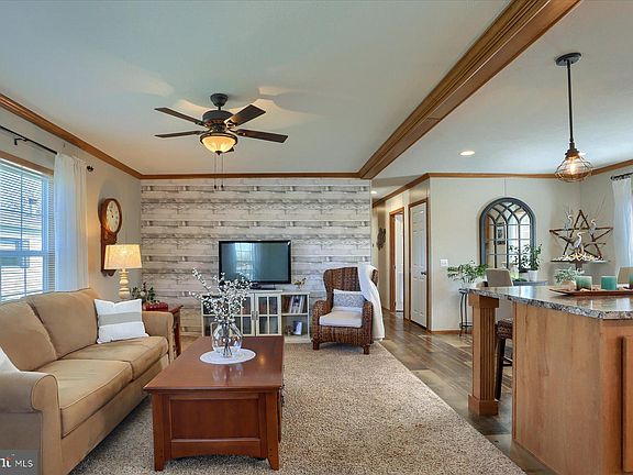 The "Queen Bee" of Country Manor Farms 55+ Community!! Less than 5 years old and still looks Brand New!! Manufactured as a 3 bedroom and 2 bath home, the current (and only) owner uses the 3rd bedroom as a craft room. Very bright and cheery home. Living room, kitchen and dining area greet you upon entrance. The kitchen boasts a large island and a pantry closet with abundance of cabinetry. The color pallet is rich with earth tones which coordinate so nicely with the Luxury Vinyl Plank floors, neutral carpeting and walls. A convenient laundry room is situated in the center of the home and has a wash tub/sink and storage cabinets and opens onto the rear entrance. Enjoy the coziness of the owners' ensuite located at the end of the home. The primary bathroom features ergonomic height sink and higher toilet seats. A walk-in shower and large linen closet round out the owners' bathroom, and the LVP flooring is the same as used in the other flooring areas. The guest bath has LVP flooring and a tub/shower combination along with comfortable sink and toilet heights. All windows tilt in for easy cleaning. The front porch, with it's stained wood decking, is very inviting to anyone who is entering this gorgeous home. A stone wraparound walkway was added a few short years ago which tops off the attractiveness of the exterior landscape. A storage shed sits to the back end of the property to house gardening equipment used to maintain the mature yard and lovely perennial shrubs and bushes. Don't miss out on owning THE nicest and newest home in Country Manor Farms.