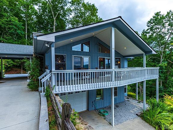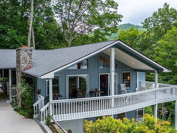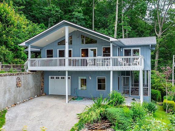 Best price compared to competition! This absolutely charming mountain getaway is located on the desirable East side of Lake Glenville! Boasting gorgeous year round long lake views -no one ever tires of watching the boats, water skiers, kayaks, paddle boards, fishermen & birds (incl eagles!)! Classic bungalow w/cathedral wood ceiling in great room/dining area w/stone gas log fireplace (can be wood burning). Spacious kitchen, small office, large laundry w/storage & sink. Enclosed sunroom & wrap-around deck overlook the lake. Master en-suite on main level. Lower level has large family room used as a bunkroom (no door from stairwell); guest bedroom w/full bath -both opening onto covered porch. Porte cochere at entrance & lower garage deep enough for 2 cars w/workshop. Concrete driveway & last house on street - Very private location w/no traffic or road noise. Water feature 'as is'. Cozy home can be enjoyed year-round or as your mountain escape! Hurry! This jewel won't be on the market for very long!! Price Reduced NOTE: SQUARE FOOTAGE ON ZILLOW, etc is WRONG! Our MLS does not quote sq ft & finished basement not included - more than 2,200 sq ft heated...