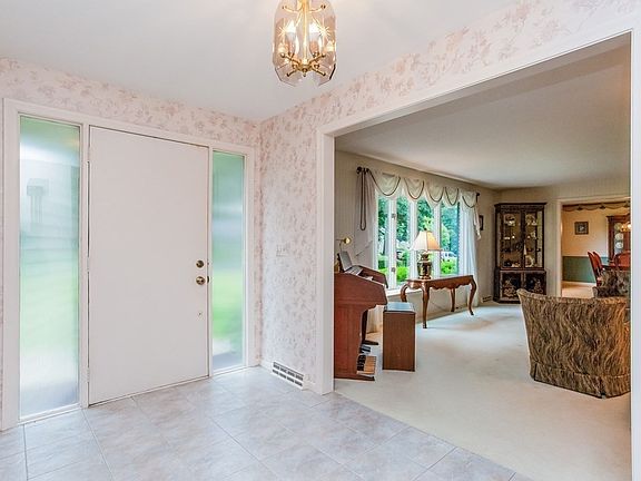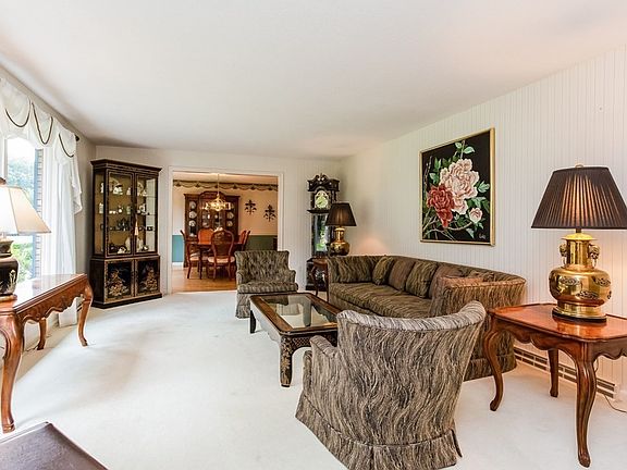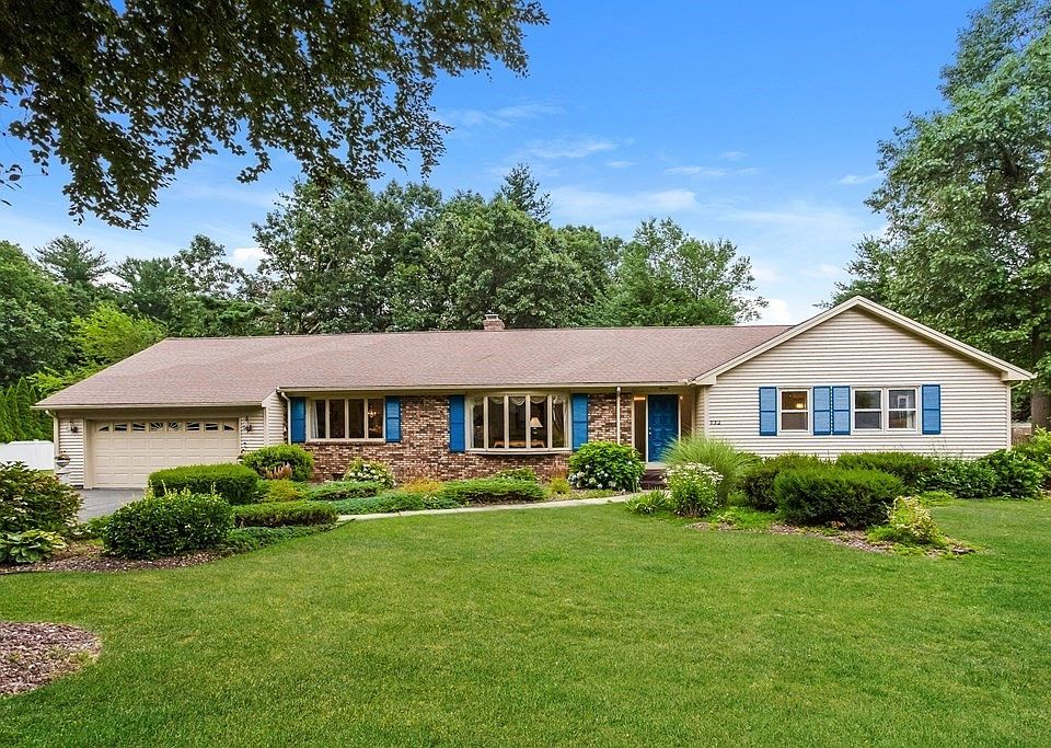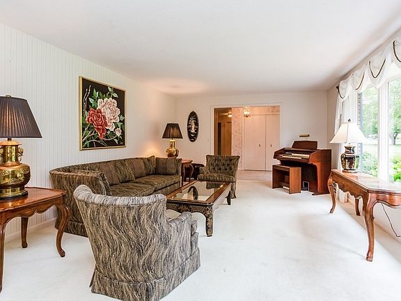 PRISTINE one owner executive ranch features fantastic location in desired area & inviting well-maintained interiors on large level lot. Wide front entry leads to spacious open living/dining room w/big windows overlooking front yard & letting natural light bathe interior. Updated kitchen features cream wood cabinetry granite countertops, tile flooring, new black stainless range, dishwasher & built-in microwave & eating area w/Pella slider leading to composite deck & back yard. Convenient mudroom area provides access to 2 car garage & 3/4 bath/laundry room. Charming den features fireplace w/brick surround & hearth & slider leading to impressive four season sunroom highlighting vaulted beamed ceiling w/skylights & recessed lighting. Bedroom wing has two bedrooms w/double closet, full bath w/ tiled tub/shower plus a primary suite w/two sets of double closets & ¾ bath w/large cream vanity & enclosed shower. Finished lower level offers additional living space & great storage space.