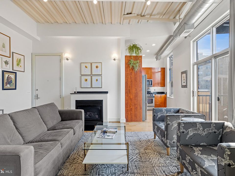 The Icon in Logan Circle | 2 Bed | 2 Bath | 750 Sf | 1 Private Balcony | Building: Built in 2003, Boutique Building, 19 Units, Elevator | Unit: 13+ Ft. Ceilings w/ Exposed Ductwork, Large Windows w/ Lots of Natural Light, Gas Fireplace w/ Mantle & Screen, Large Walk-In Closet w/ Custom Storage, Hardwood Flooring Throughout | Kitchen: Ample Built-In Cabinetry, Black Granite Countertops, Stainless Steel Appliances, Gas Range, Full Size Dishwasher | Bath: Stall Shower & Shower/Tub Combo in Primary Bath, Quartz Topped Vanities w/ Storage, Full Size Tub, Tile Flooring