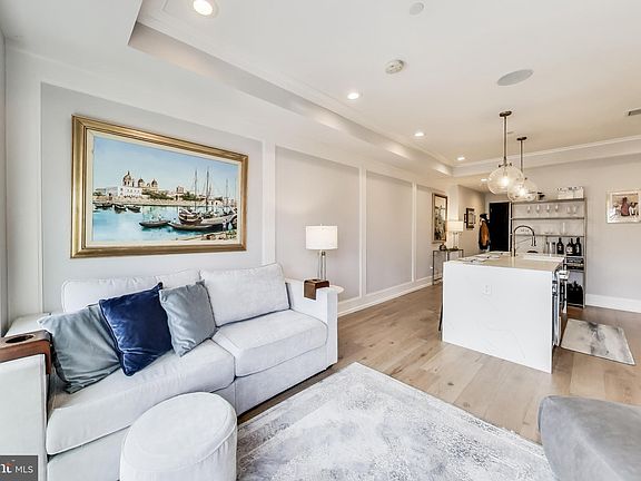 Located on a tree-lined street in the 14th Street corridor, this elevated first floor unit offers quiet luxury close to the hustle and bustle of the city's best restaurants & nightlife. Situated in a small, self-managed condo building with low fees, grocery shopping is easy - a quick trip to the local Whole Foods just blocks away and up a half flight of stairs to the building door, and you will enter your condo at the rear of the first floor hallway. The foyer hallway allows for a graceful entry into the home with pegs for your coats, a recessed area for a drop zone table, and a powder room - great for easy access and for guests. Once in the main room of the unit, you'll notice the large, chef's kitchen with GE Monogram stainless steel appliances, waterfall quartz counters and white oak hardwood floors. A large island can seat four. Beyond the kitchen is the living space, replete with custom wall moldings, cove ceiling, and a cute private balcony - perfect for a morning cup of coffee, and evening glass of wine, and a small herb garden. Large balcony doors and floor to ceiling windows in the living room and bedroom offer amazing south-facing light all year round. The primary bedroom fits a king size bed, and offers storage galore with a custom walk in closet system. The closet is big enough to add in a small desk or vanity for work from home or a get ready station. The primary en suite bathroom has spared no expense - marble double vanity sink, custom storage, separate water closet, and a spacious shower area make this a lux hotel-like experience. This pet-friendly & rental-friendly building holds appeal by being situated just blocks to Franklin Hall, Rooster & Owl, Tatte Bakery, Bus Boys & Poets & More. It's a 10 minute walk to the U Street Metro, and just a block from the D50 Bus Route from Takoma through McPherson Square, Smithsonian, and the Wharf to LeEnfant Plaza Metro.
