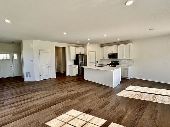 Charlotte Designer Select model at Legend Lakes.Welcome home to a spacious foyer entry + powder room. Step into an open concept great room, kitchen and dining room area with sliding glass door access to the outdoor patio. Easy living with the kitchen open to the dining room and great room. Fine finishes include Aristokraft 42' white kitchen cabinets, built-in pantry closet, spacious center island, Quartz countertops and GE stainless steel appliances. Walk upstairs to the 2nd level and enjoy spacious bedrooms + the convenience of a 2nd floor full size laundry room. The primary suite features a huge walk-in closet + a primary bath featuring raised height Aristokraft 35" white cabinets, quartz vanity with undermount bowl, walk-in shower with clear glass door, brushed nickel trim, ceramic tile surround + linen closet. In addition to an impressive primary suite, The Charlotte features a spacious 18x13 2nd bedroom, 9' first floor ceilings, decorative rails, ventilated closet shelving, Shaw carpet and engineered wood flooring in the kitchen, foyer, powder room, bathroom and laundry room. Ceramic tile floors in baths and laundry.